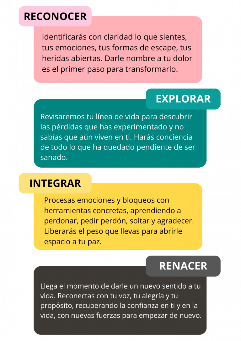 Te ofrezco un acompañamiento uno a uno, personalizado, para que atravieses tu proceso de duelo con claridad, contención y esperanza. No importa si han pasado meses o años, si todavía sientes que la vida sigue, pero tú no encuentras tu lugar… este programa es para ti. Aquí no hay fórmulas rápidas ni frases vacías. Caminaremos juntas, paso a paso, con estructura, amor y herramientas reales, a través de mi método R.E.I.R., porque sanar también es volver a sonreír desde el alma.